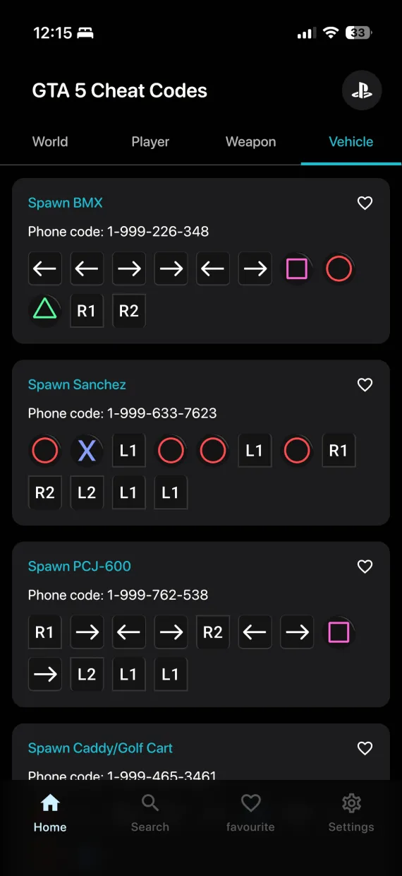Access cheat codes for GTA Vice City and GTA 4 on all platforms. Drive cars on water, spawn tanks, maximize health and armor, and unlock every weapon. Our app provides detailed instructions for each cheat code with platform-specific button sequences.